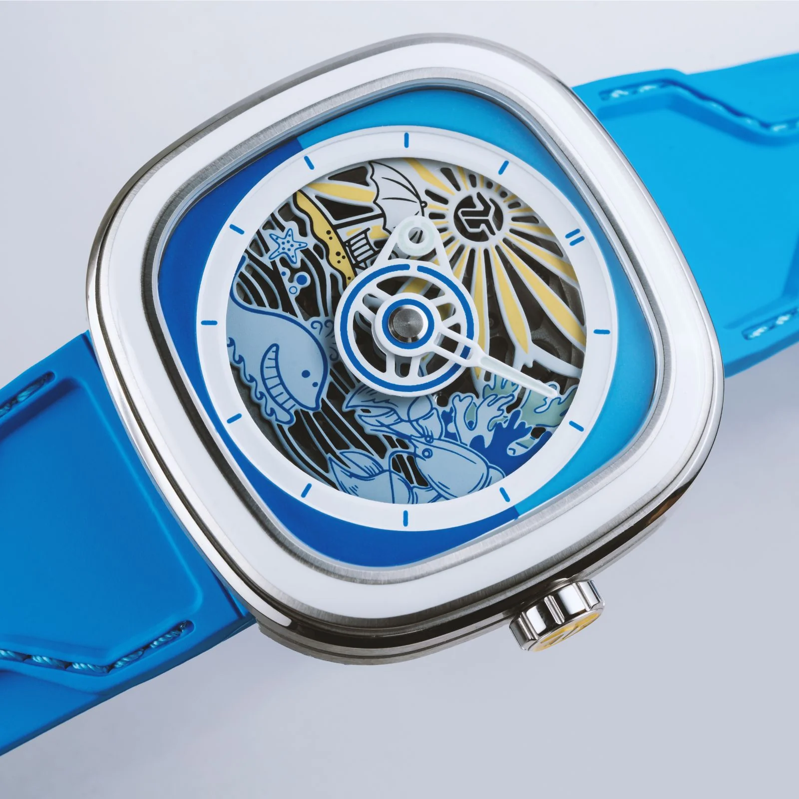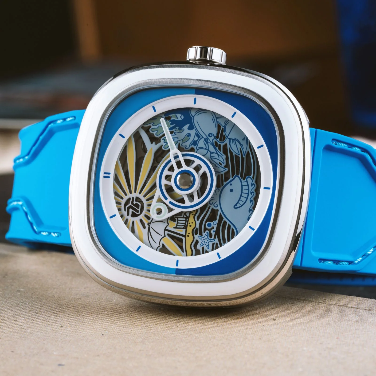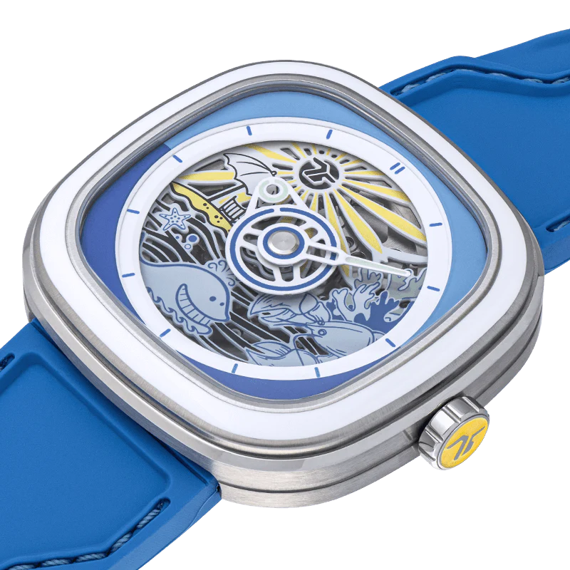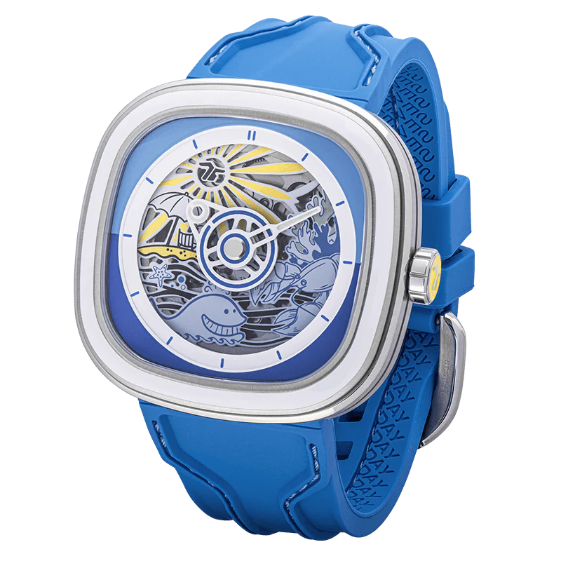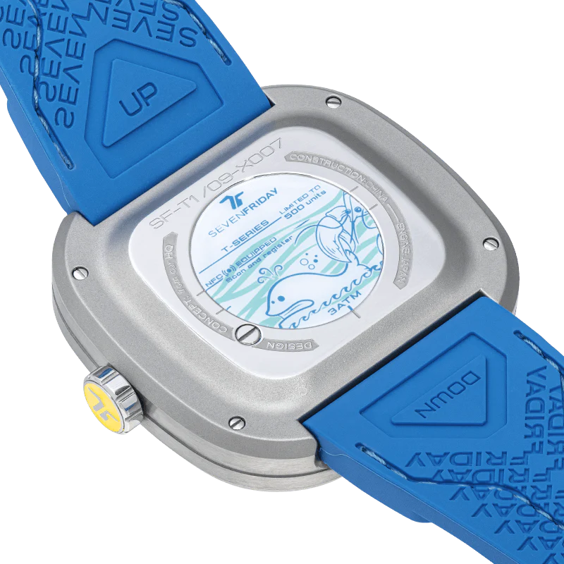 - Correa:Correa de silicona suave azul con costuras azules y verdes incrustadas y múltiples patrones SEVENFRIDAY en la parte posterior.